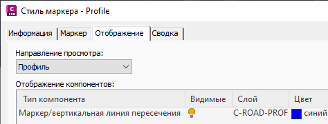 Компонент «Маркер/вертикальная линия пересечения» позволяет управлять отображением как маркера (используется для отображения профилей пересечений, характерных линий, фигур съемки и 3D-полилиний), так и вертикальной линии пересечения (используется для отображения пересечений трасс).