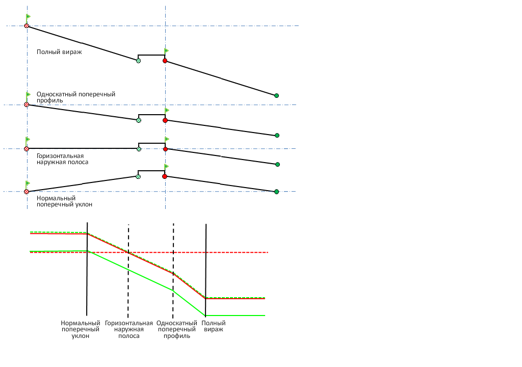 На следующей иллюстрации описан метод точки вращения во внешней области кривой для односкатных дорог с разделительной полосой.