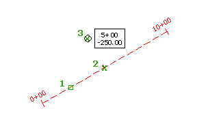 Для выбранной трассы (1) задайте требуемый пикет (2) и величину смещения (3). При перемещении трассы метка перемещается вместе с ней, сохраняя относительное значение пикета и смещения.