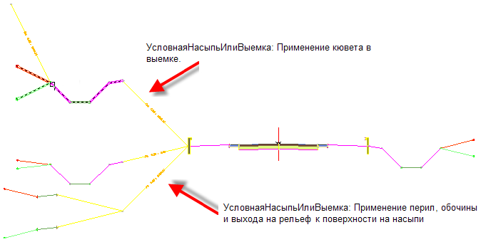 На следующем рисунке показан пример конструкции, содержащей элемент конструкции "УсловнаяНасыпьИлиВыемка", который настраивается на применение кювета в случае выемки, и другой элемент конструкции "УсловнаяНасыпьИлиВыемка", который настраивается на применение перил, обочины и выхода рельефа на поверхность в случае насыпи.