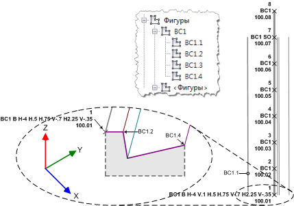 Точка 101: "BC1" – имя линейного объекта, " " (пробел) представляет собой разделитель элемента/кода, "B" является кодом <Начало>, "H" – код <Смещение по горизонтали>, -4 – значение первого смещения по горизонтали, "V" – код <Смещение по вертикали>, .1 – значение первого смещения по вертикали, – и так далее для остальных 3 смещений. Точки 112, 123, 134, 145 и 156: продолжается фигура BC1 с текущими смещениями. Точка 167: "BC1" продолжается, но построение смещенных фигур останавливается с помощью кода остановки смещения (<Останов смещений>) "SO". Точка 178: фигура "BC1" продолжается. За кодом "Смещение по горизонтали" должно следовать значение. Отрицательное значение смещает активную фигуру влево, а положительное значение – вправо. Можно использовать несколько смещений, но если выполняются последующие переходы по горизонтали или по вертикали, все предыдущие коды смещений по горизонтали или по вертикали должны быть указаны для каждого смещения. |