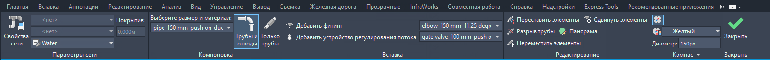 - Укажите на панели ленты Компоновка размер и материал труб напорной трубопроводной сети.