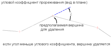 Уменьшение количества вершин, созданных вдоль объекта наилучшего вписывания. Коэффициент прореживания игнорирует вершины, отклоняющиеся меньше, чем на значение параметра "Угловой допуск". При больших значениях угла отклонения выполняется прореживание большего количества точек. Значение параметра "Угловой допуск" измеряется в угловых единицах. Значение "Углового допуска" должно быть меньше значения параметра "Расстояние" для добавления.