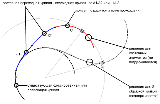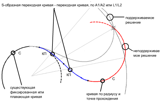 К кривой добавляется группа плавающих S-образных кривых "Переходная кривая - переходная кривая - кривая" с заданным радиусом и точкой прохождения.