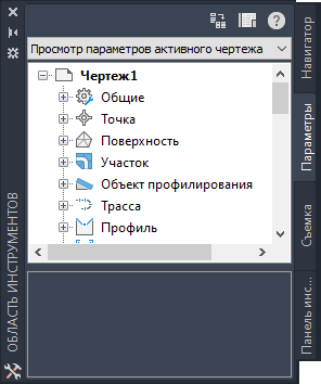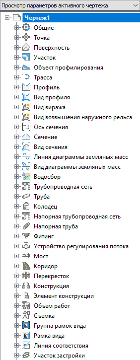 Дерево вкладки Параметры используется для управления стилями объекта, метки и таблицы и настройки параметров для чертежей и команд.