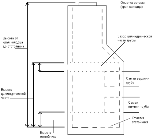 Отстойник и глубина отстойника. Отстойником называют нижнюю часть или камеру внутри соединительного элемента, например, водосбора. Область отстойника иногда используется как емкость для сбора осадка. Глубиной отстойника называют расстояние от самой нижней точки колодца до дна самой нижней из соединенных с ним труб. Глубина отстойника у определенного типа колодца может быть разной, в зависимости от проектных требований. Люки обычно не характеризуются глубиной отстойника.