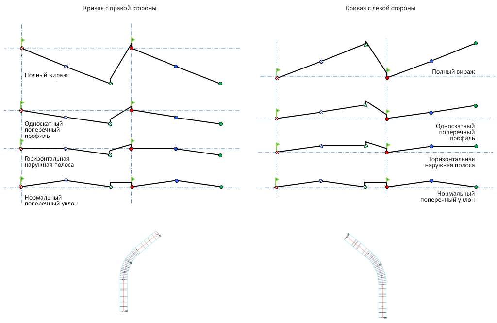 На следующей иллюстрации описан метод точки вращения с левой стороны для двускатных дорог с разделительной полосой.