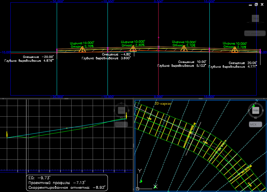 При выборе области реконструкции внутри коридора появятся три видовых экрана, отображающие поперечное сечение коридора для данного пикета (вид поперечного сечения), вертикальный профиль для сечения (вид профиля) и расположение поперечного сечения коридора вдоль трассы коридора (вид в плане).