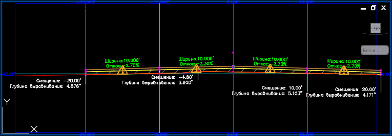 Если абсолютное значение разницы поперечных уклонов превышает абсолютное значение допустимого отклонения поперечного уклона, отображается нарушение.