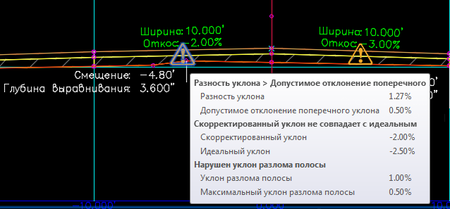 Если значение скорректированного поперечного уклона не равно значению идеального поперечного уклона, отображается нарушение.