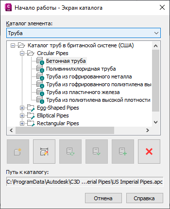 С помощью диалогового окна можно выбрать для работы каталог труб или каталог колодцев и просмотреть категории внутри выбранного каталога.