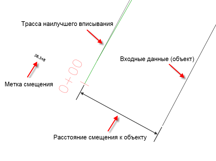 Метки демонстрируют положительное или отрицательное расстояние горизонтального смещения от трассы наилучшего вписывания до входных данных (объектов). Положительное значение указывает на то, что входные данные находятся справа от трассы наилучшего вписывания (если она начинается в пикете 0+00), а отрицательное значение указывает на то, что входные данные находятся слева от трассы наилучшего вписывания.