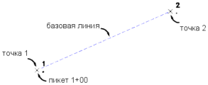 | точка 1 | Идентификатор существующей точки для начальной точки базовой линии. Данной точке назначается номер пикета, заданный для компонента пикета. |