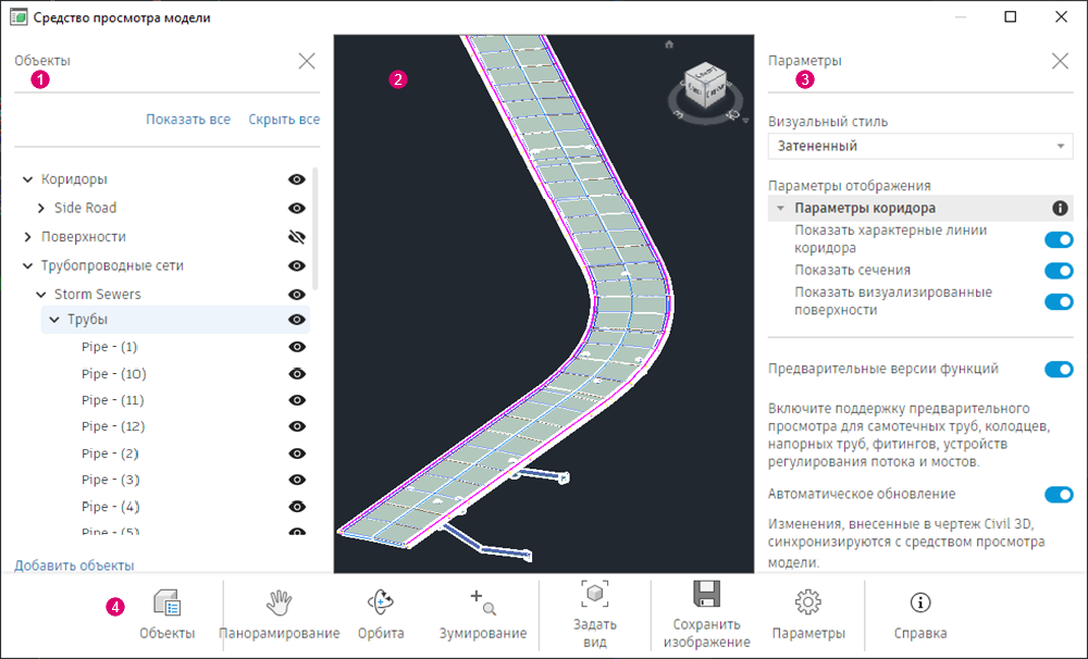 на панели инструментов средства просмотра. Дополнительные сведения см. в разделе Панель «Объекты» в средстве просмотра модели Civil 3D.