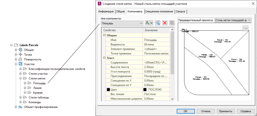 Стили меток могут включать в себя текст, блоки, линии, засечки и выноски. Метки можно просматривать при помощи диалогового окна "Создание стиля метки", которое показано на следующей иллюстрации.