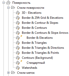 На следующем чертеже приведен пример коллекции стилей объектов в дереве вкладки "Параметры":