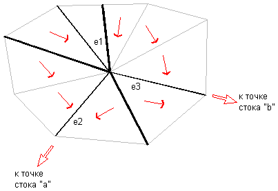 Вода, текущая вниз по каналу 1, может достичь любого из этих стоков. В подобных случаях область, вода с которой поступает на ребро e1, определяется в Autodesk Civil 3D как многостоковый водосбор.