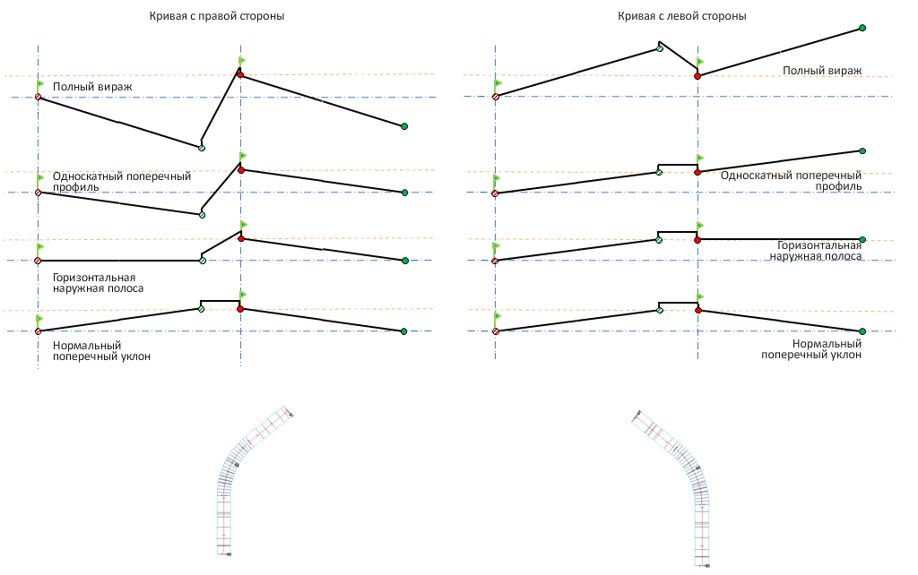 На следующей иллюстрации описан метод точки вращения с левой стороны для односкатных дорог с разделительной полосой.