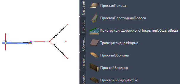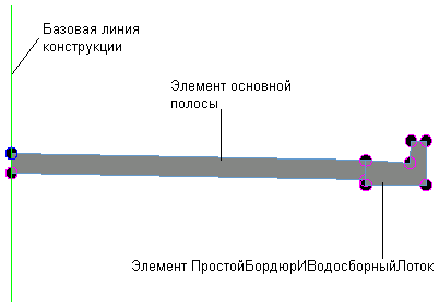 На иллюстрации ниже показана простейшая конструкция, представляющая собой одну из частей (полос) дороги с двумя полосами движения. Одна полоса движения с бордюром и водосборным лотком образована путем добавления на базовую линию трассы объектов-элементов конструкций с именами "ПростаяПолоса" и "ПростойБордюрЛоток".
