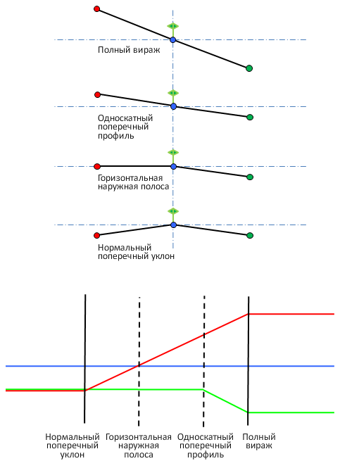 На рисунке ниже приведено описание метода вращения в центре базовой линии для двускатной дороги без разделительной полосы.