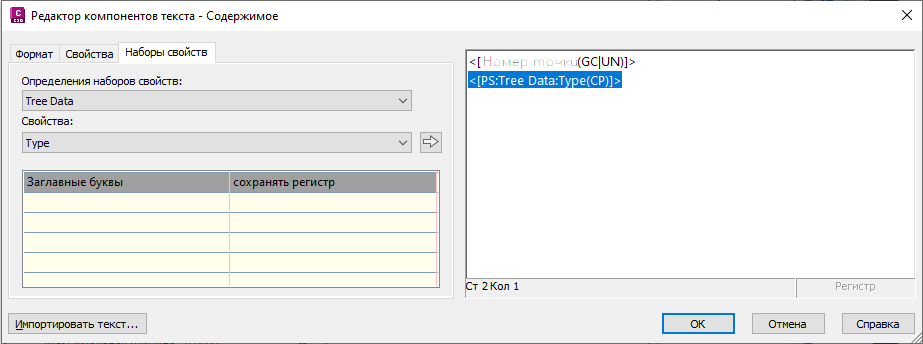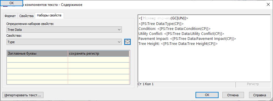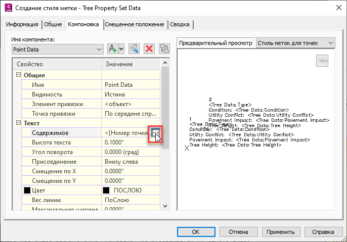 для вставки свойства в текстовое окно. В следующем примере свойство «Тип» было добавлено к стилю меток после номера точки.