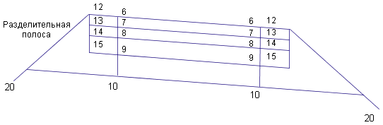 На приведенной ниже иллюстрации показано местоположение стандартных кодов звеньев на элементах конструкции, описывающих дорогу с пониженной разделительной полосой и выступающими обочинами.