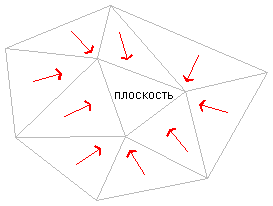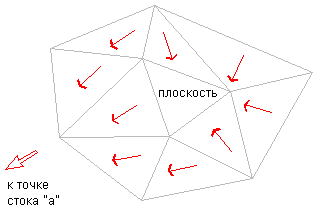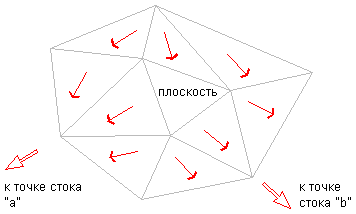 Если некоторые из противолежащих неплоских треугольников представляют собой откос вниз от границы плоской области, но вода поступает со всех таких треугольников в один и тот же сток, тогда плоская область является частью водосбора для этого стока “a”, как показано на следующем рисунке: