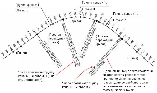В ходе создания трассам автоматически назначаются метки, указанные в диалоговом окне "Метки трассы". Метки устанавливаются вдоль трассы в определенных точках, например у основных и неосновных пикетов.
