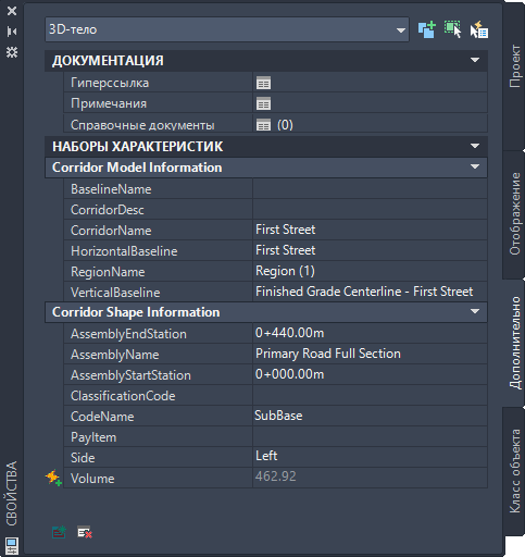 По умолчанию Autodesk Civil 3D содержит три определения наборов свойств, которые применяются к коридорам и 3D-телам и корпусам: