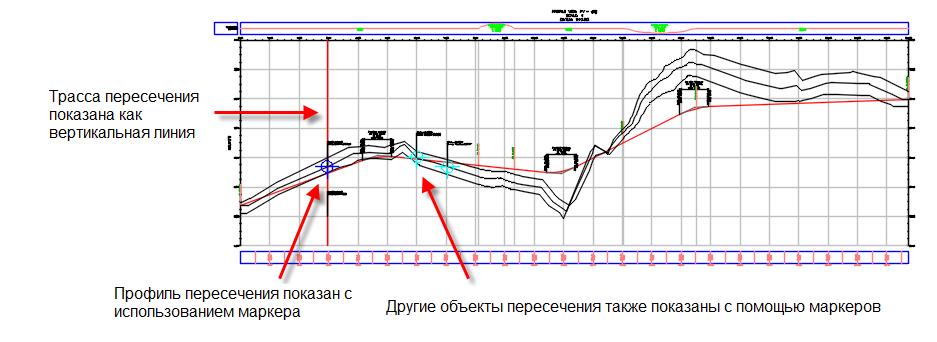 Трассы пересечений отображаются на виде профиля как вертикальные линии, поскольку им не назначены отметки, при этом можно задать значение отметки для меток трасс пересечений.