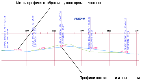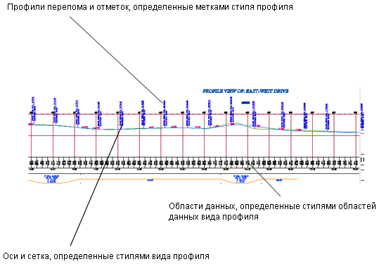 Можно создавать профили без их отображения в виде профиля. При создании вида профиля можно задать отображение любого профиля, созданного на основе выбранной трассы. Чтобы сделать вид профиля более понятным или информативным для пользователя, можно сконфигурировать в нем области данных и примечания к профилю.