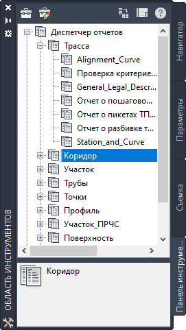 Вкладка "Панель инструментов" используется для организации отчетов по каждому типу объектов. Отчеты содержат полезные инженерные данные чертежа в компактном, портативном формате. Некоторые из них имеют формат LandXML и используют стандартные или пользовательские таблицы стилей. Другие отчеты является отчетами формата .NET с пользовательскими диалоговыми окнами, которые позволяет пользователю выбирать данные и различные параметры.