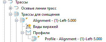Трассы для смещения добавляются в коллекцию «Трассы для смещения» в Навигаторе. Созданные профили для смещения добавляются в коллекцию «Профили», которая находится в коллекциях именованных трасс для смещения.