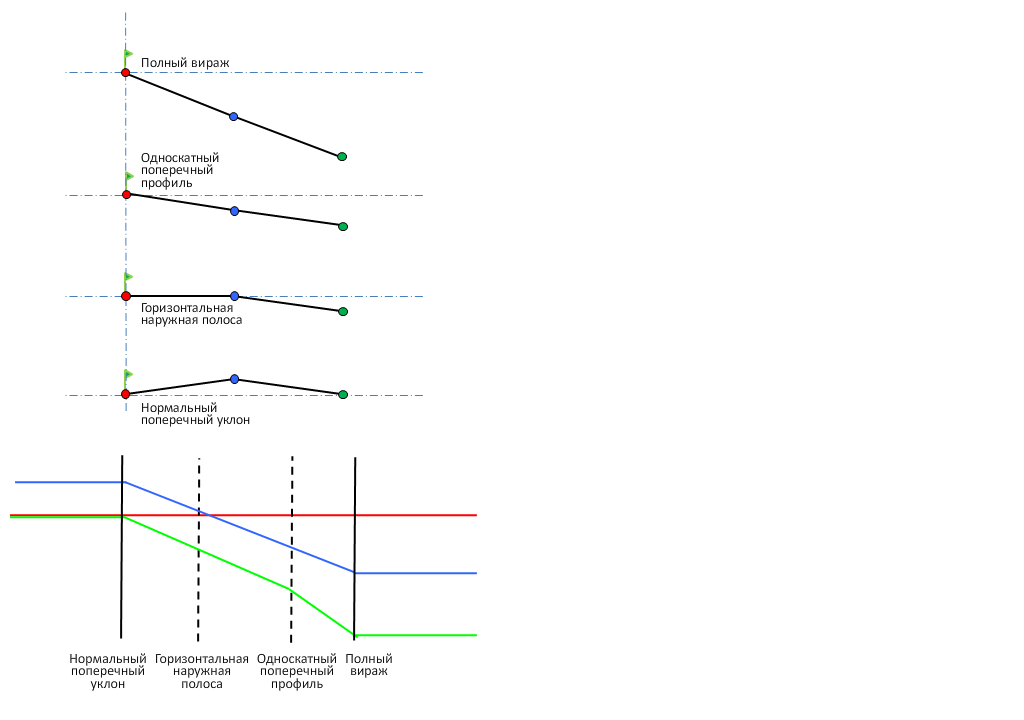 На рисунке ниже приведено описание метода вращения на внешней области кривой для двускатной дороги без разделительной полосы.