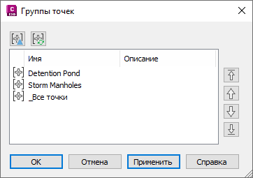 Последовательность отображения групп точек в чертеже определяет последовательность, в которой группы точек прорисовываются после открытия чертежа или обновления изображения. Первая (верхняя) группа точек списка прорисовывается последней.