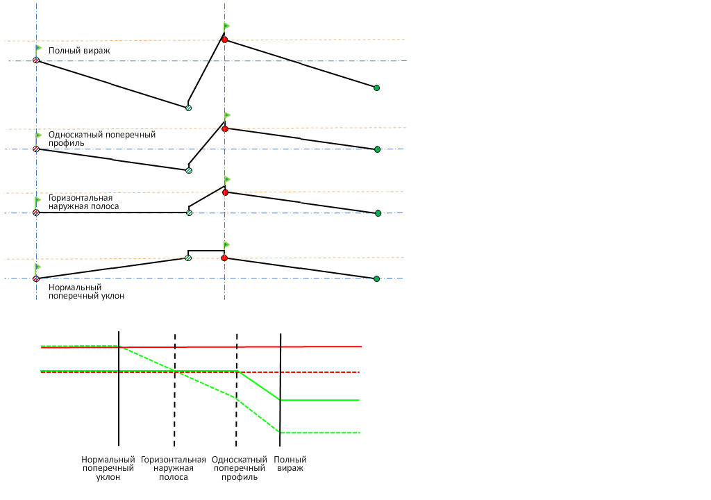На следующей иллюстрации описан метод точки вращения во внешней области кривой для односкатных дорог с разделительной полосой.