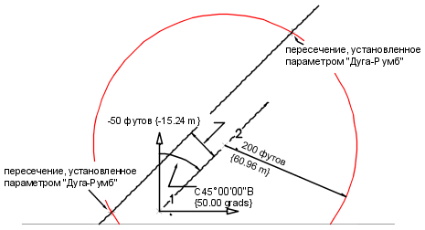 Определяются пересечения между дугой с радиусом 200 и центром в точке 2 и румбом 50,0000, проведенным из точки 1 с расстоянием смещения 50 влево.
