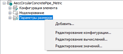 - В окне модуля просмотра "Семейство элементов" нажмите правую кнопку мыши на узле "Параметры размеров" и выберите из контекстного меню "Редактировать значения".