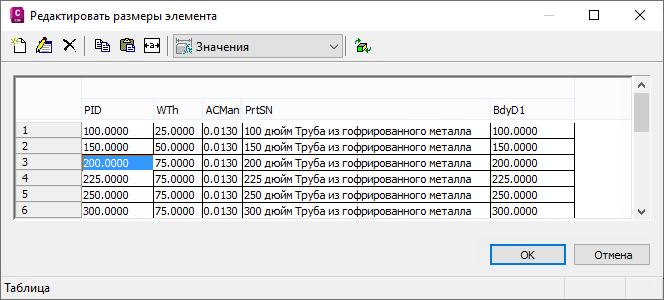 - Для изменения значений размеров труб выберите строку и ячейку размера. Для редактирования дважды нажмите кнопку мыши.