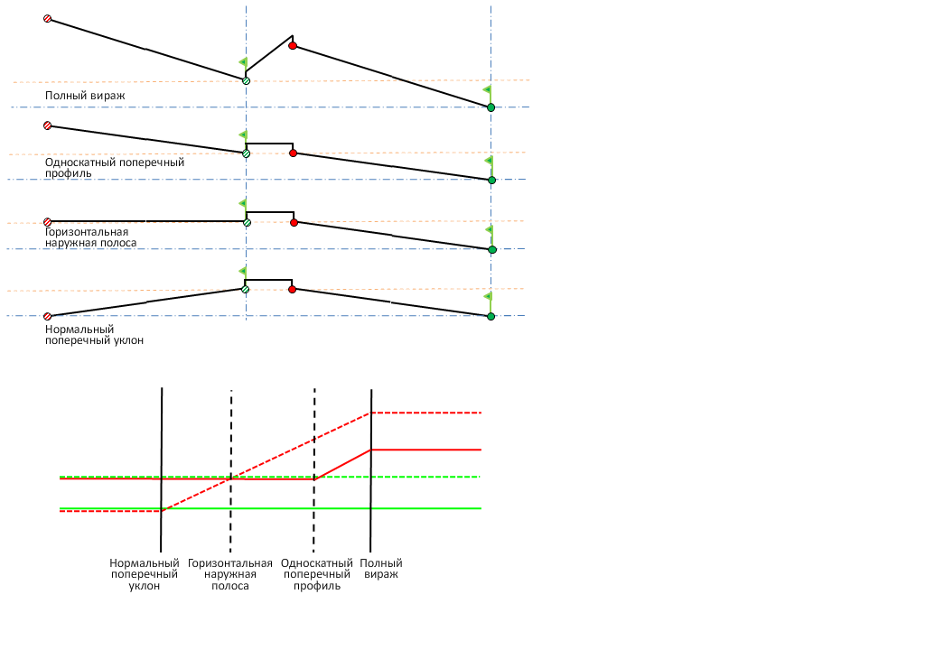 На следующей иллюстрации описан метод точки вращения во внутренней области кривой для односкатных дорог с разделительной полосой.