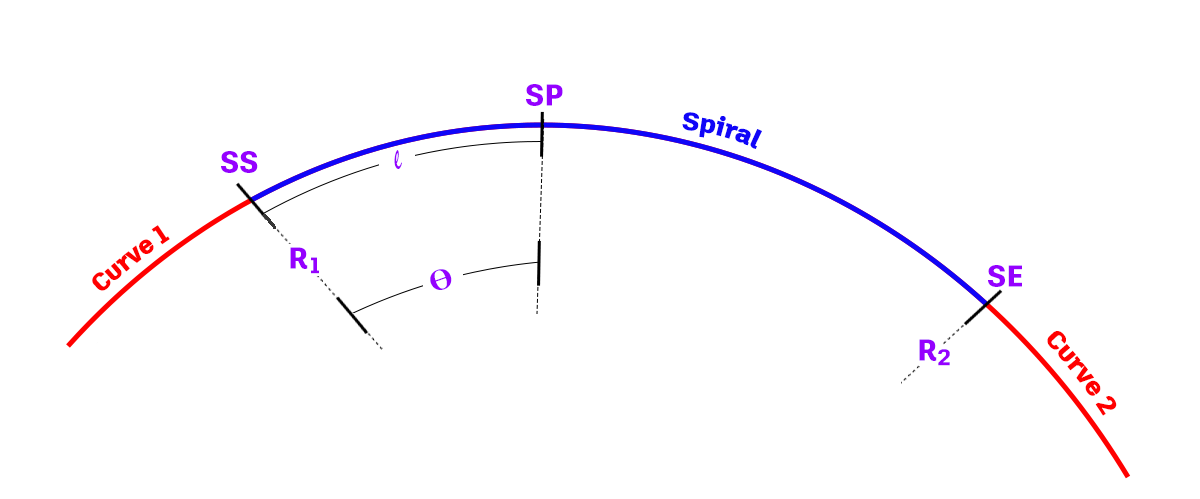 При проектировании и разметке переходных кривых часто используются такие параметры как L (длина переходной кривой) и R. Параметр R обозначает радиус кривизны на одном конце переходной кривой. Чтобы различать радиусы в начале и конце переходной кривой, можно использовать значения R1 и R2.