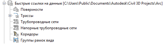 Быстрые ссылки на данные используются для поверхностей, трасс, профилей, групп осей сечений, коридоров, трубопроводных сетей, напорных трубопроводных сетей и групп рамок видов.