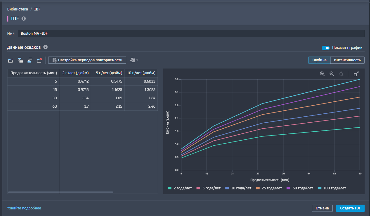 Данные IDF определяют взаимосвязь между интенсивностью (или количеством) осадков и их продолжительностью для разных периодов повторяемости (или частоты).