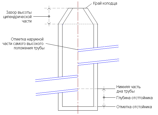 При перемещении отстойника колодца вверх, когда свойство "Управление отстойником:" установлено в значение "Отметка", отстойник может только перемещаться вверх до нижней части площади зазора вертикальной трубы.