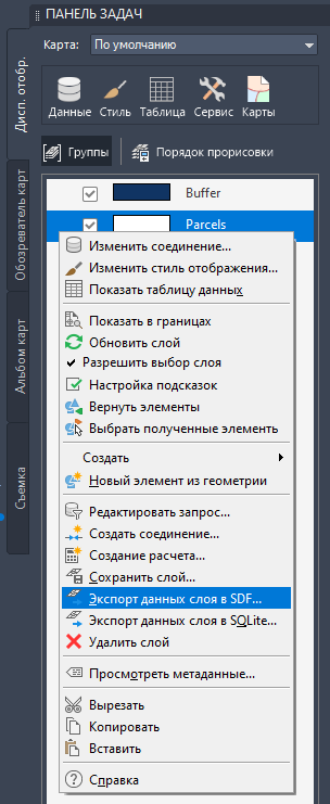 Щелкните правой кнопкой мыши слой земельных участков, чтобы его экспортировать