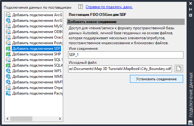 - В окне "Подключение данных" в списке "Подключения данных по поставщикам" (слева) выберите "Добавить подключение SDF".