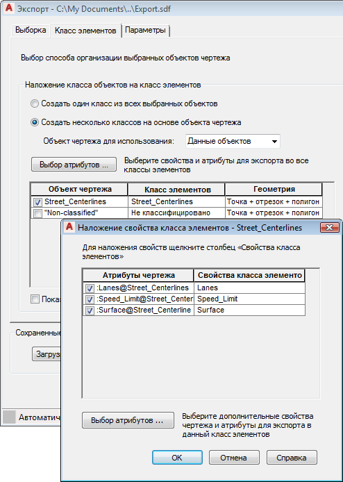 При экспорте объектов чертежа можно использовать данные объекта для создания классов элементов в файле SDF. Полученные классы элементов имеют свойства, которые соответствуют атрибутам данных объекта.