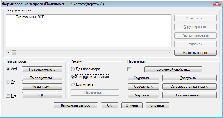 - В диалоговом окне "Формирование запроса на извлечение подключенных чертежей" в группе "Тип запроса" выполните следующие действия.