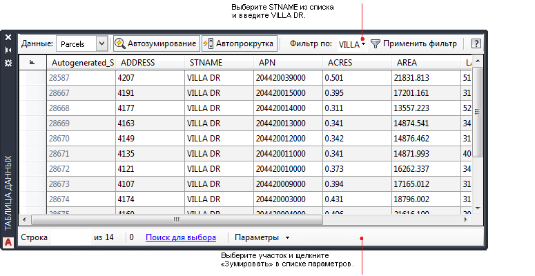 Откройте таблицу данных для любого слоя. Отфильтруйте таблицу данных, чтобы отобразить набор участков (в данном случае отобразите только участки на улице Вилла Драйв).