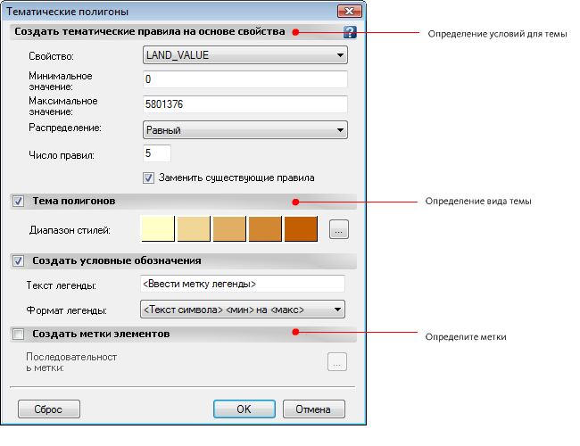 - В диалоговом окне "Слой темы" в разделе "Создать тематические правила на основе свойства" щелкните стрелку вниз рядом с кнопкой "Свойства" и выберите LAND_VALUE.